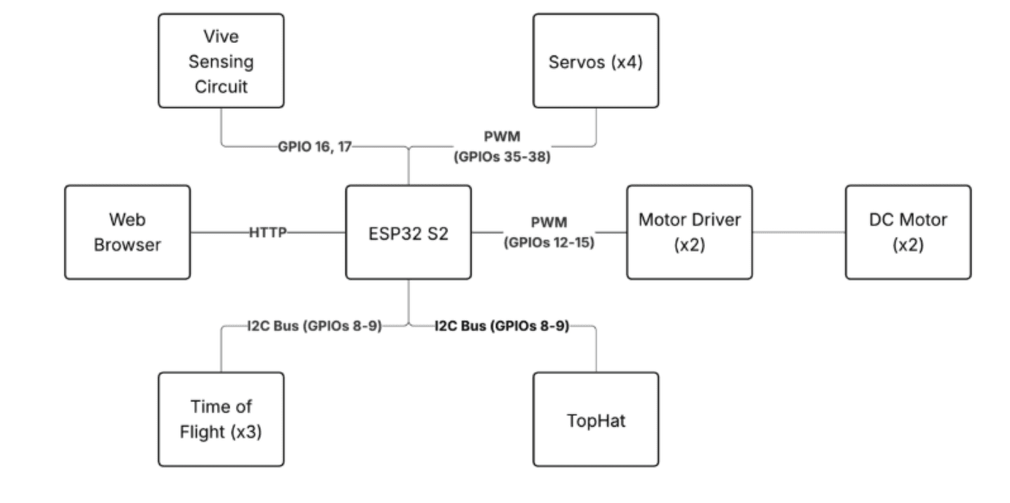 We ultimately designed and built a two-wheel differential-drive autonomous robot powered by an ESP32, integrating Time-of-Flight sensors for wall following, Vive-based localization for absolute position awareness, PID-controlled motor actuation, and a Wi-Fi–based control framework to support seamless switching between autonomous and manual modes. The robot was engineered as a complete mechatronic system, with mechanical design, embedded software architecture, sensing, and control developed in parallel to meet competition constraints.