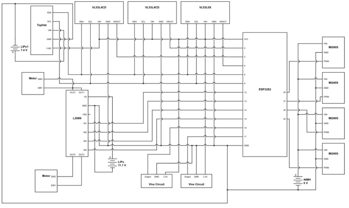 Power Architecture: Implemented a multi-rail power design separating logic and sensing electronics from high-current actuation, using dedicated battery packs and onboard regulation to power the ESP32-S2, DC motors, and MG90S servos independently, preventing voltage sag and electrical noise during aggressive maneuvers.